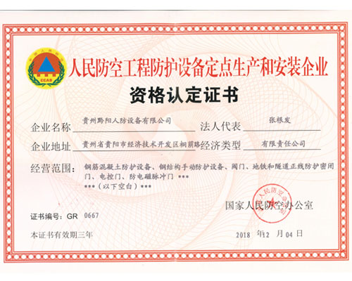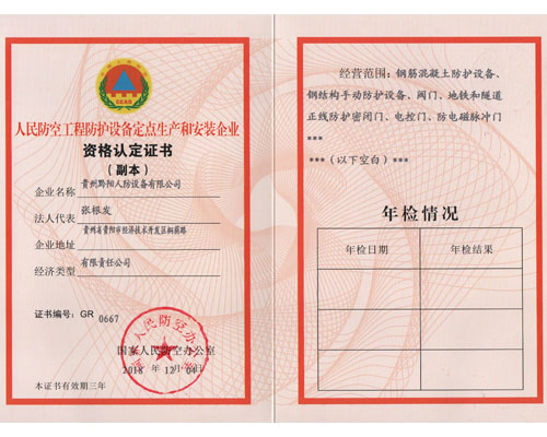 貴州黔陽人防設備有限公司具有獨立法人資格企業,公司成立于2005年,注冊資金2008萬元,經營范圍為鋼筋混凝土防護設備、鋼結構手動防護設備、閥門及地鐵和隧道正線防護密閉門。公司擁有一支長期從事國防軍工工作,技術、管理水平高的人防工程生產制作及施工安裝專業隊伍和一批高、中級工程專業技術人員。本公司占地面積13800多平方米,具有各種專業機械加工設備、先進的質量檢測儀器設備,大型的專用工作平臺、震動平臺及其他專業平臺,年生產能力10000樘以上。多年來,凡由我公司承接的工程項目,在施工制作、安裝方面,一直受到各級人民防空辦公室及開發商的好評。被貴陽市國防動員委員會評為“貴陽市人民防空先進單位” ;被國家貴陽經濟技術開發區評為“目標管理先進企業”,并且是ISO 900......